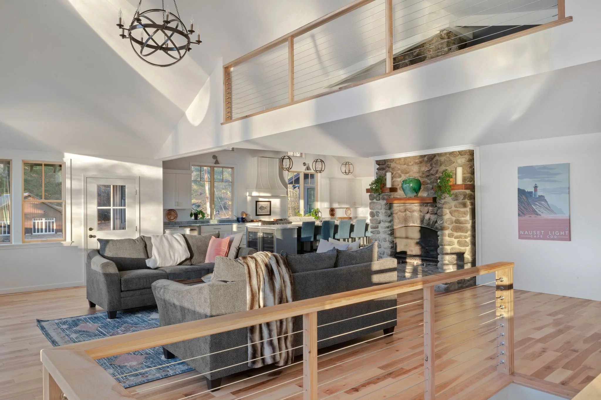 The design emphasizes natural materials that root the house to its setting. Existing stonework was retained and restored, including the substantial rock fireplace that remains the focal point of the main living space. Wood finishes, simple detailing, and a restrained material palette reinforce the lodge character and complement the surrounding forest and shoreline.